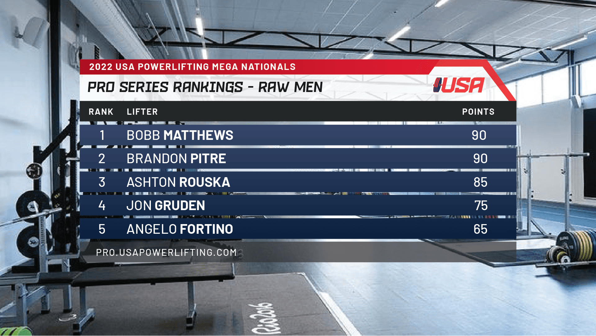 A new standings graphic was a feat. It had to be configurable by weight class, division, or flight, and sortable by total or coefficient.